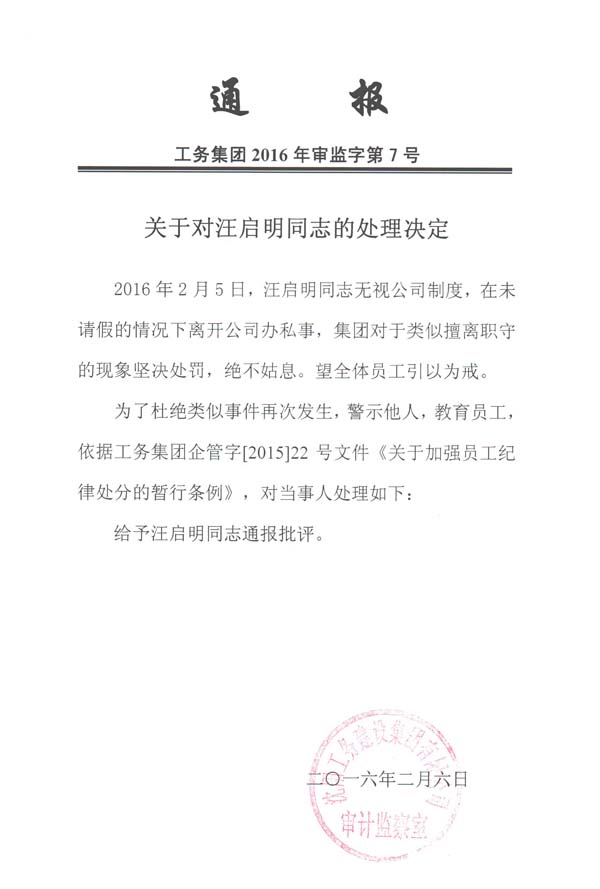 上一篇:工務(wù)集團(tuán)2016年審監(jiān)字第5號《關(guān)于對朱文帥同志的處理決定》...