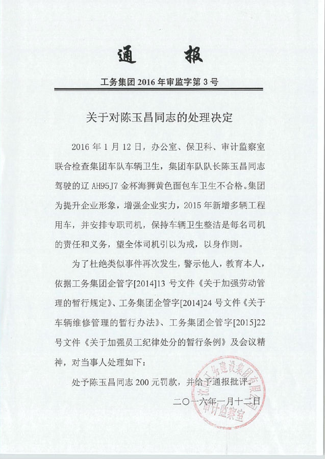 工務集團2016年審監(jiān)字第3號《關于對陳玉昌同志的處理決定》