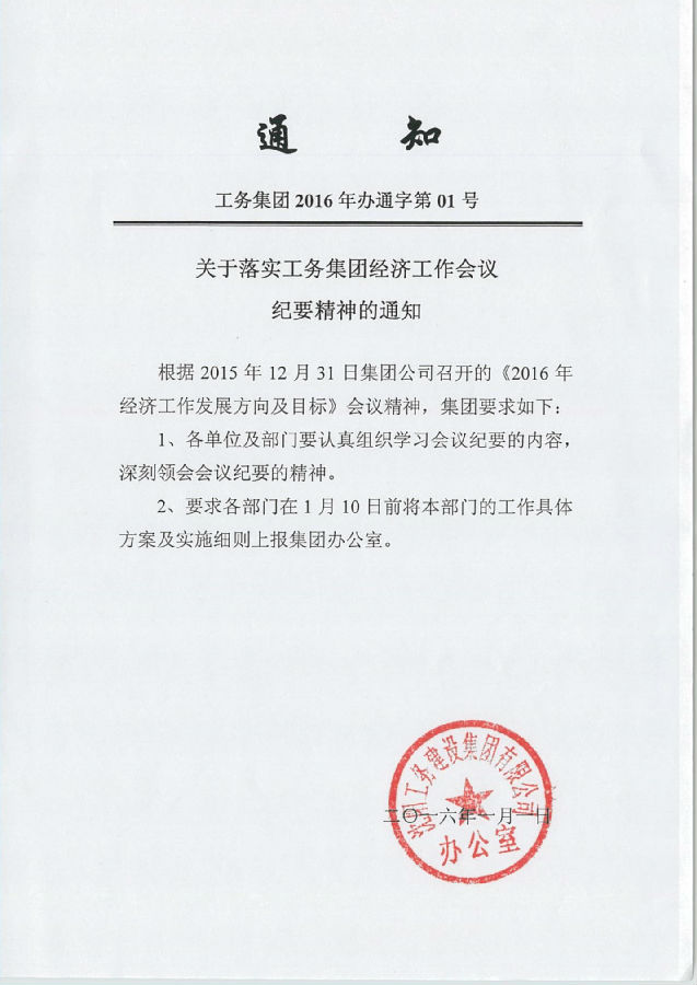 工務(wù)集團(tuán)2016年辦通字第01號《關(guān)于落實(shí)工務(wù)集團(tuán)經(jīng)濟(jì)工作會議紀(jì)要精神的通知》